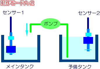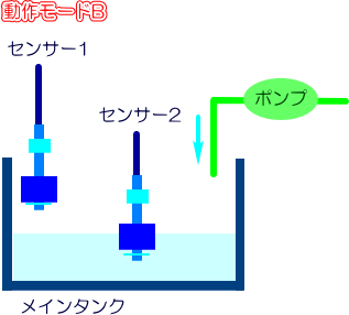 動作モードBは更に複雑な動作が可能です。二つのセンサーを一つのタンクに設置し、センサー1の水位が下がっていてセンサー2の水位も下がった時点でスイッチが入ります。さらにセンサー1の水位が上がるまでスイッチが入ったままになります。このモードでは「センサー2まで水位が下がったらセンサー1まで水位を上げる」といった使い方ができます。 |